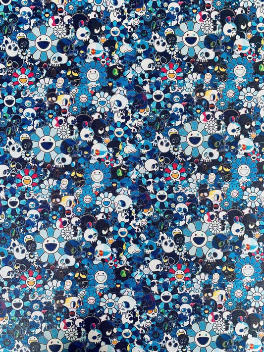 Takashi Murakami Leather Fabric ,Smile Face Flower Leather Hand-made Shoes Leather ,Hand-made Bag Leather By Yard ( Blue )