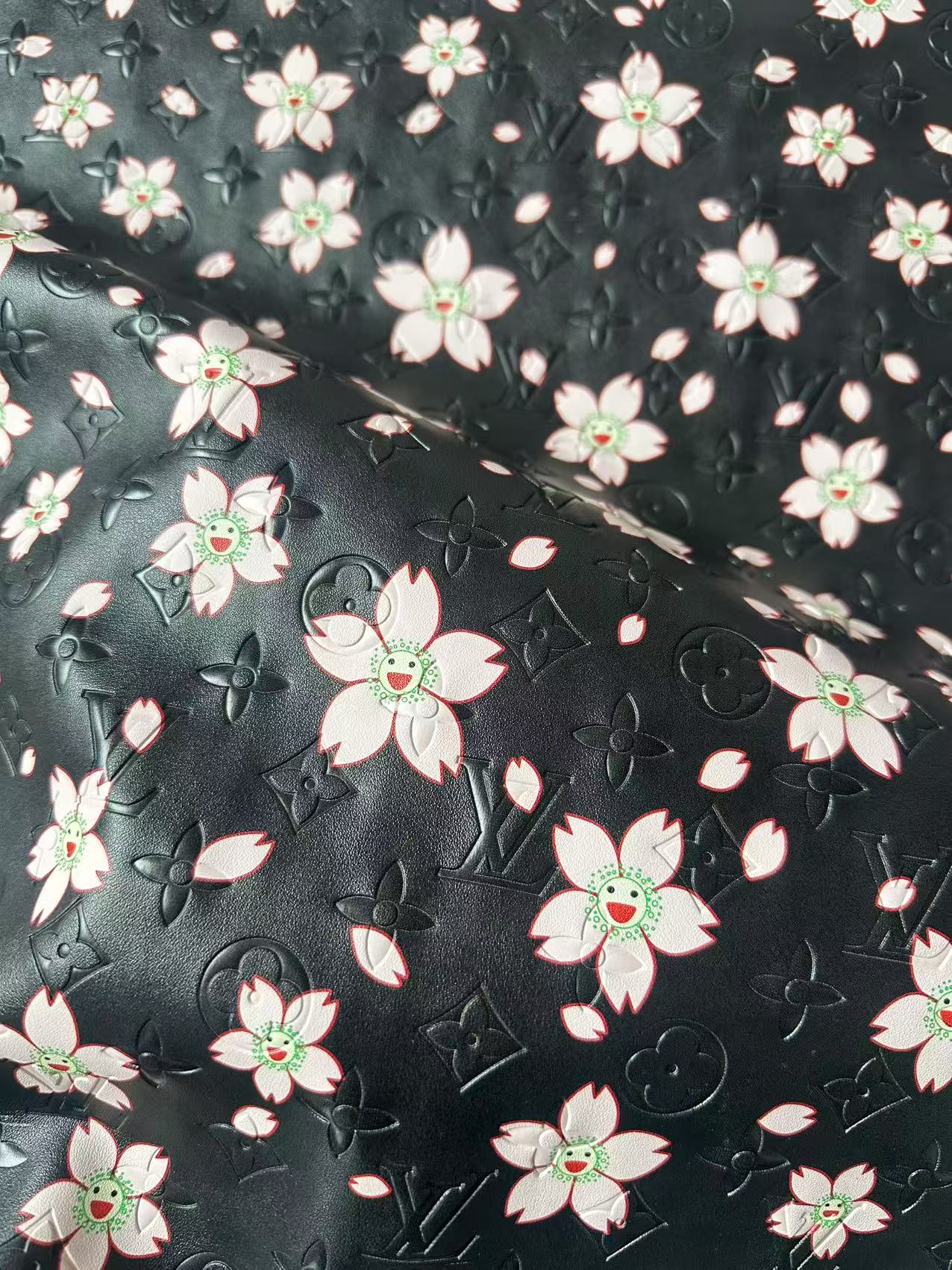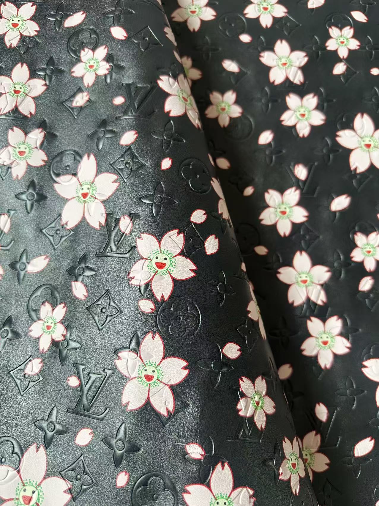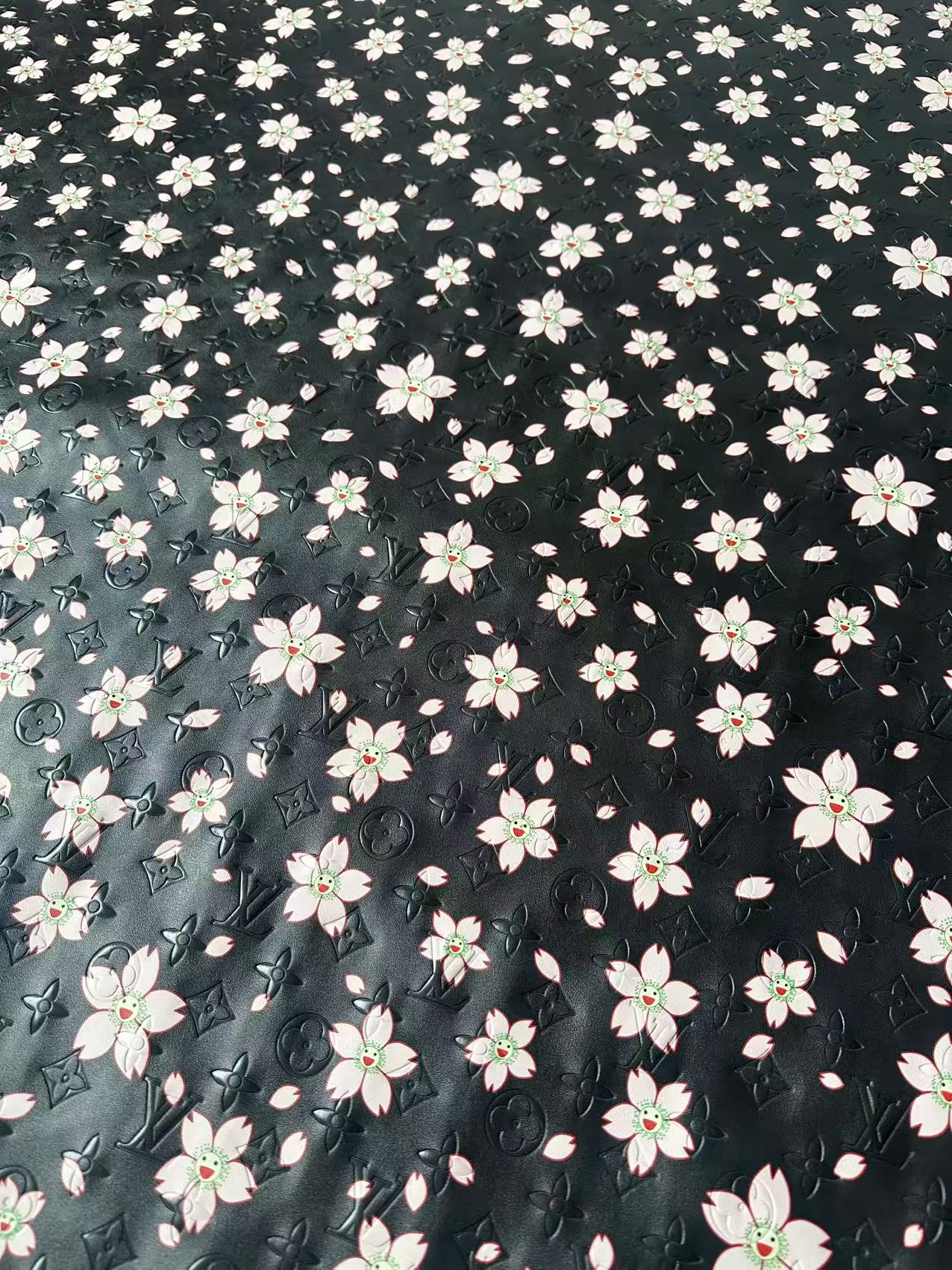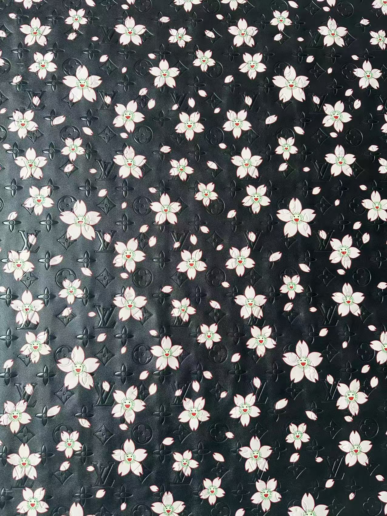 Fashion Black LV With Cherry Blossoms Embossed Leather For Handmade Sneaker,Bag ,Upholstery By Yard