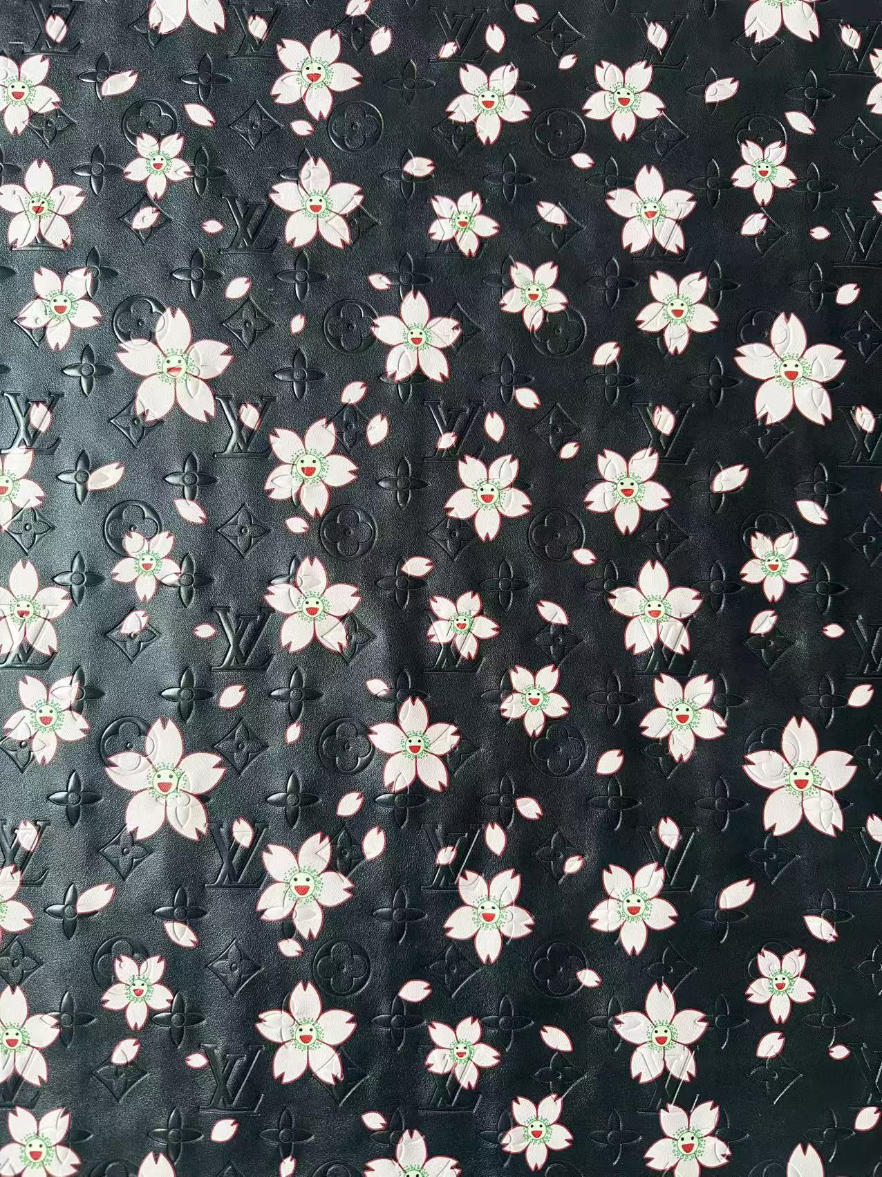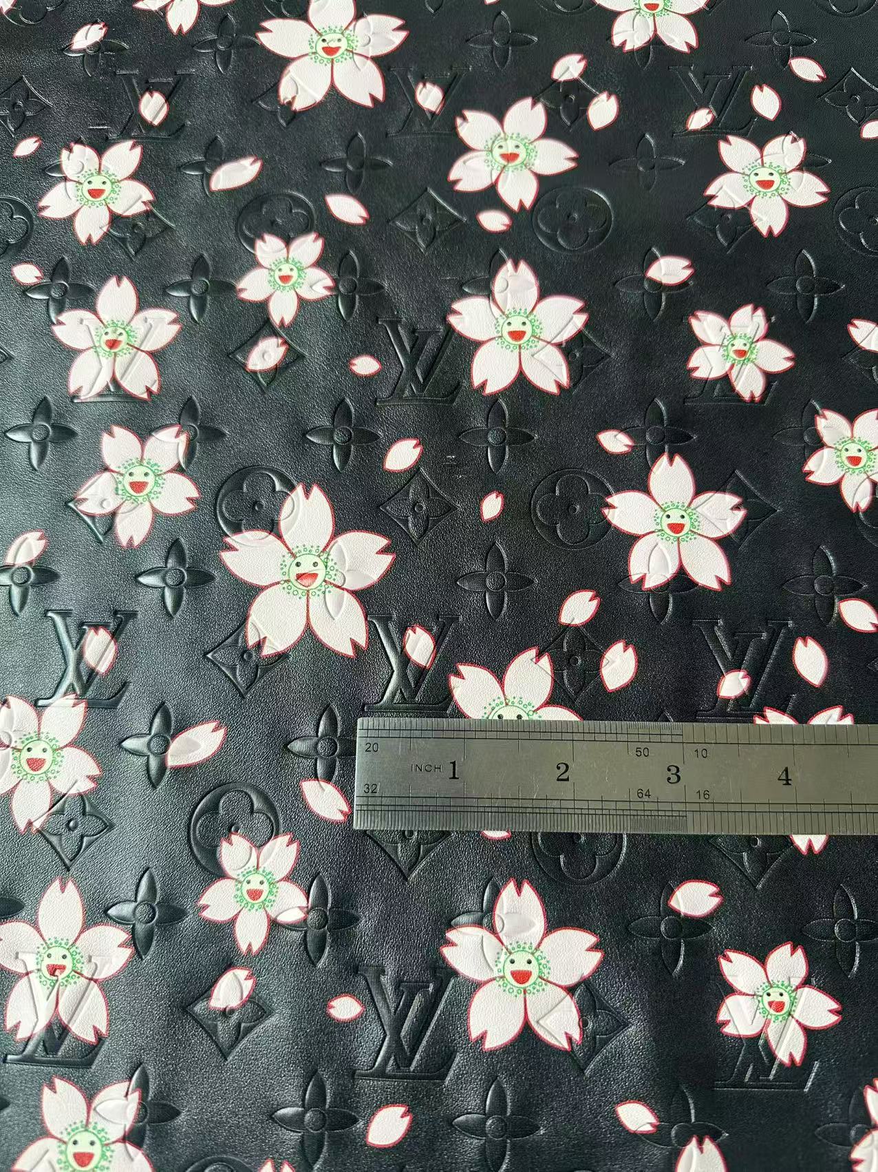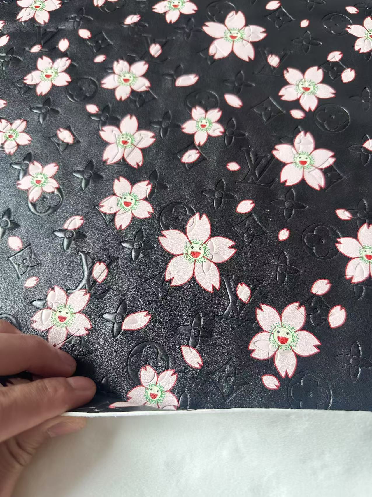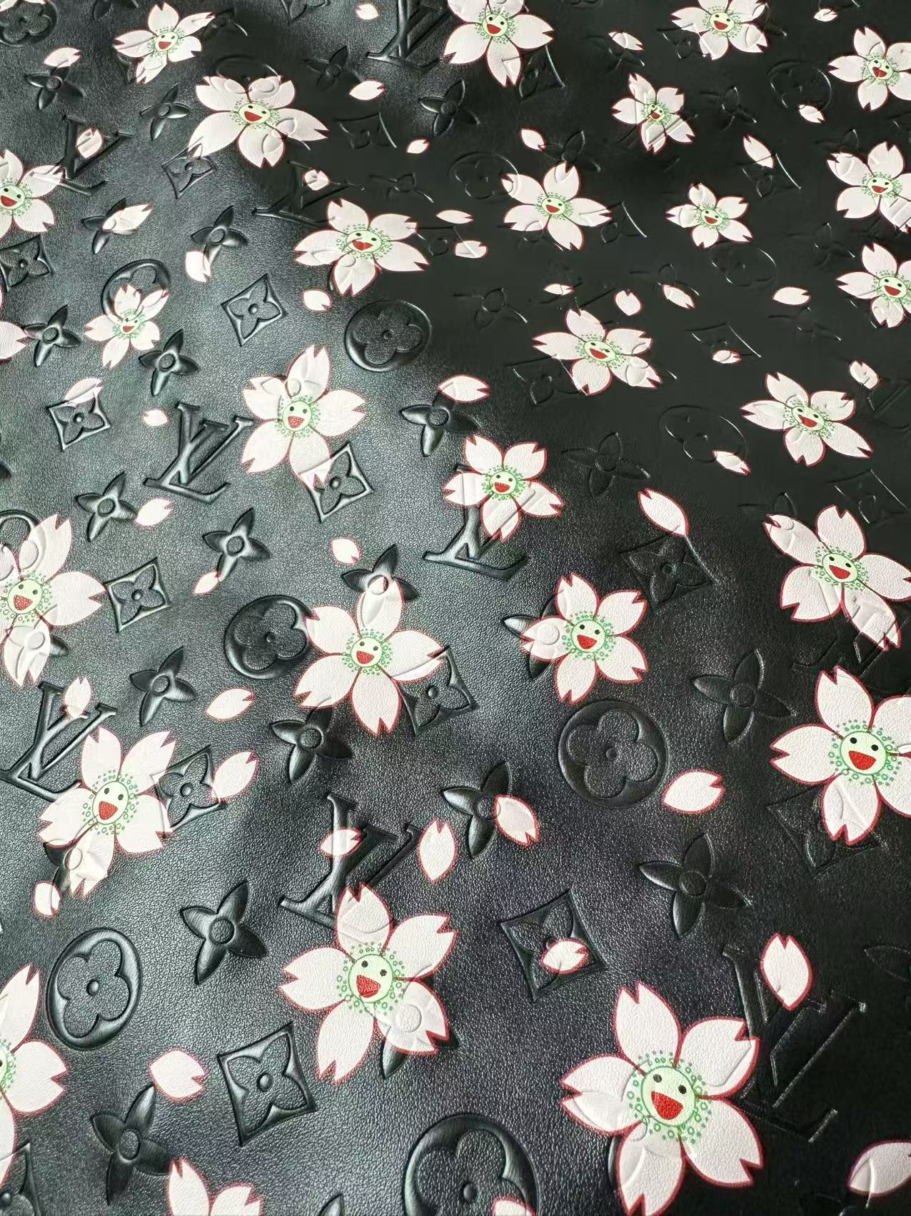 Fashion Black LV With Cherry Blossoms Embossed Leather For Handmade Sneaker,Bag ,Upholstery By Yard