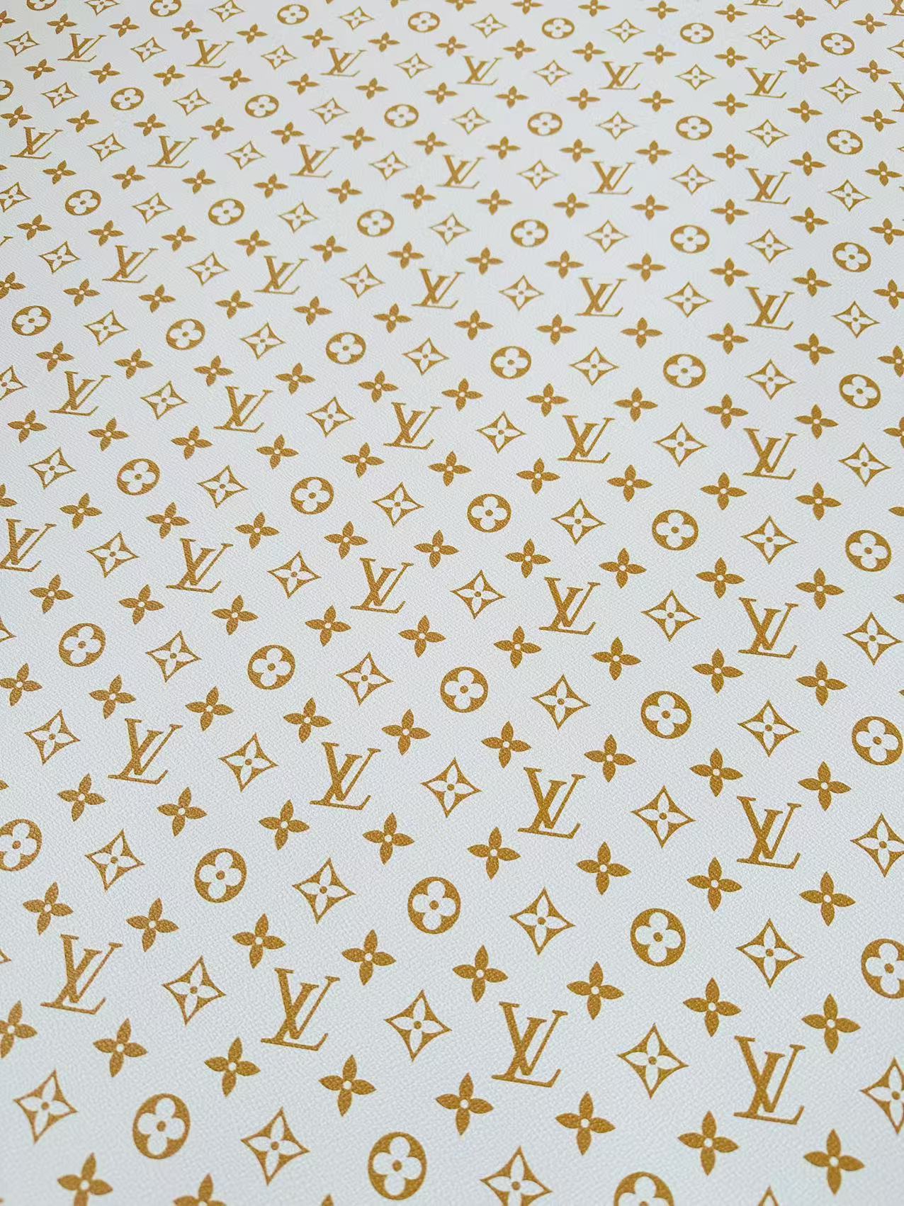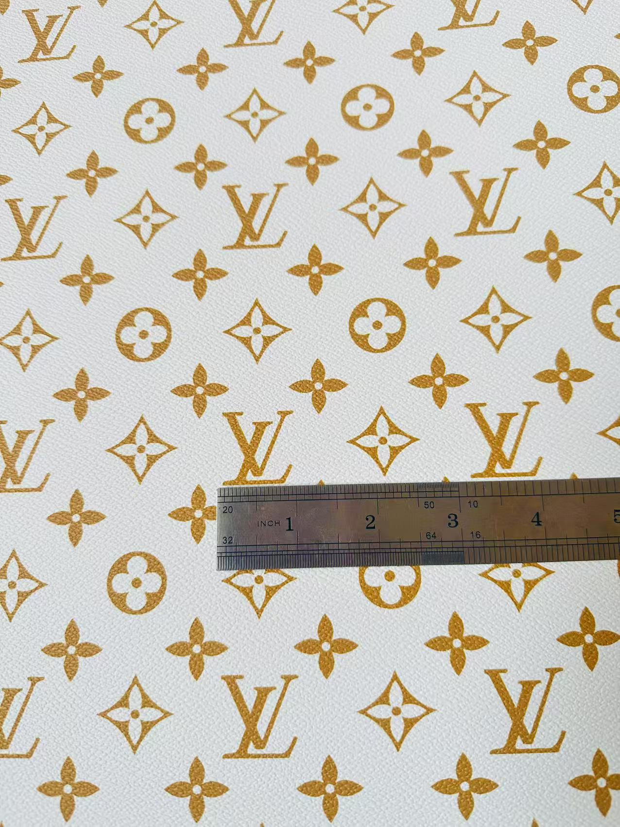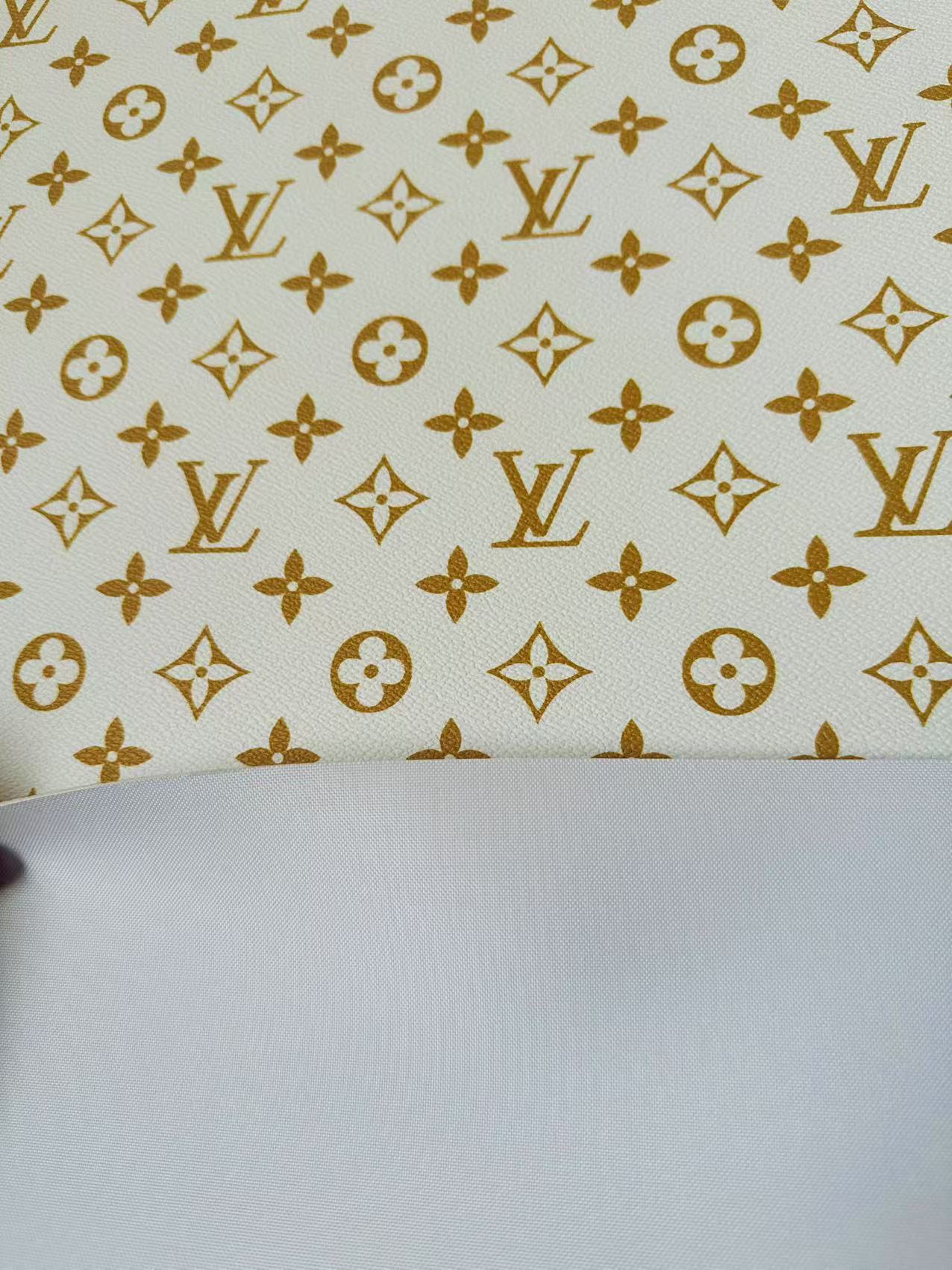 Fashion White With Gold LV Vinyl Leather For Handmade Sneaker, Upholstery Handicraft By Yard
